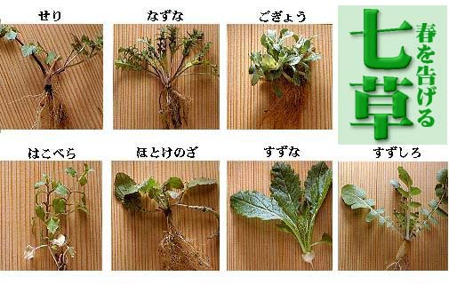日本では、平安時代の始めには宮中で行なわれ、その後、宮廷貴族の間に行なわれていたものが、庶民に広まったものである。門松や松飾りを取り除くのが「七日正月」までで、この期間を松の内という。土地によって一定してないが、関東では七日まで、京都では十五日までをだいたい松の内と呼んでいるようである。その正月七日に粥に七種の若菜を入れて祝うのである。七種菜はふつう、芹、薺(なずな)、御行(ごぎょう)、はこべら、仏の座、菘(すずな)、すずしろの七種であるが地方で異なるところもある。